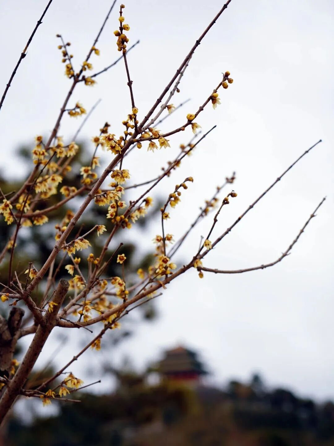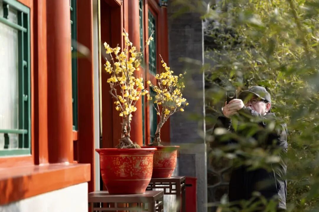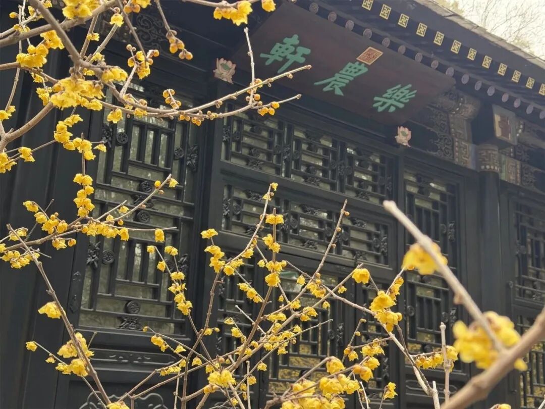 颐和园乐农轩以民间木屋的样式修建,在乐农轩青砖砌墙,石片盖顶的朴素屋舍前一簇簇鹅黄色的蜡梅花缀满枝头,花量较往年明显增多。鹅黄色的蜡梅,花瓣娇嫩欲滴、清雅可人,吸引游客拍照打卡。