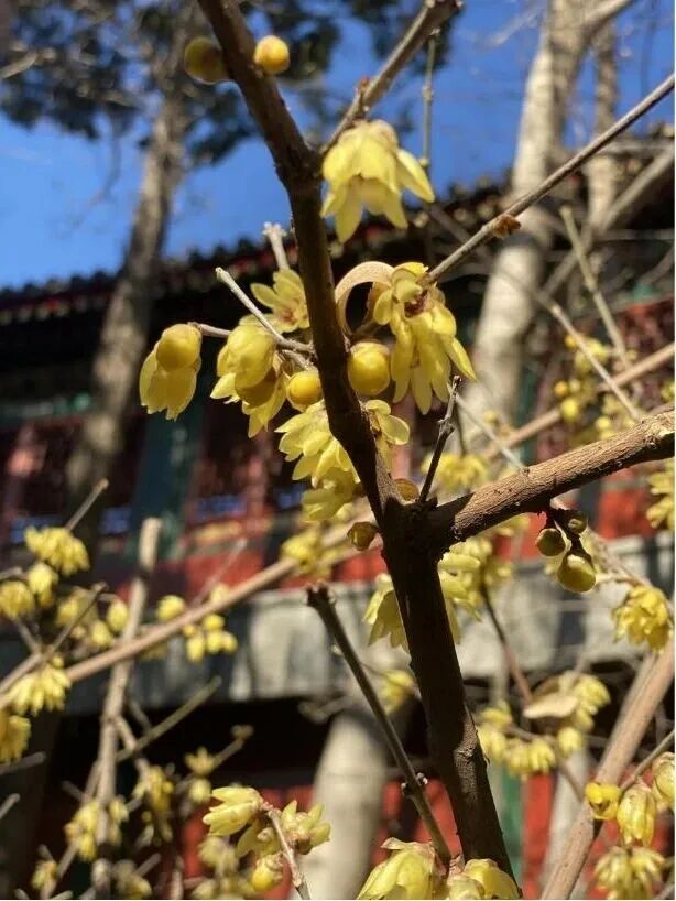 国家植物园(北园)卧佛寺一直以来都是蜡梅观赏胜地,这里栽植有“素心”“磬口”“狗牙”等多个品种的蜡梅,共百余株,主要分布于入口处放生池周边以及三世佛殿的东侧路。目前卧佛寺内蜡梅已进入盛花期,一簇簇金黄缀于枝桠,为早春的古寺增添了一抹灵动生机,金黄色的玲珑花苞在古香古色的红墙绿瓦衬托下,更显娇嫩。预计整体花期可持续至3月中旬。